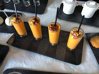 Chupito de salmorejo con crujiente de jamón o ajo blanco con uvas